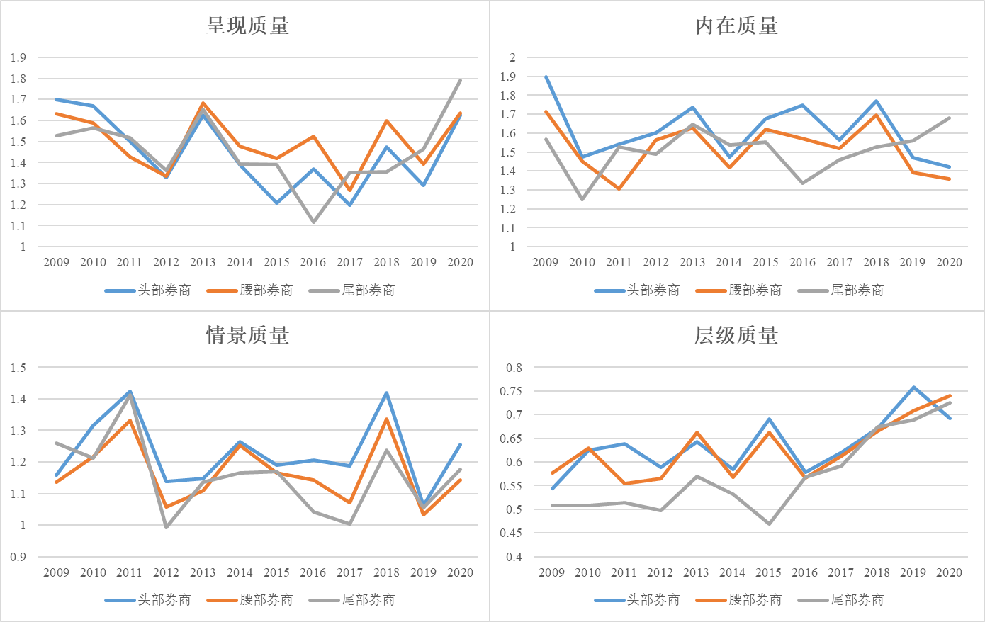 “不难发现,由于内在质量和情景质量对于分析师报告质量和使用者的投资决策至关重要,指数得分的提升需要强大研究团队和充分研究资源的支撑,腰部券商和尾部券商在这两个方面赶超头部券商存在较大困难。相较而言,呈现质量和层级质量更多强调报告的展现形式和结构特征,对于资源的依赖度更低,可学习性和可提升性更强。因此,为了与头部券商研究形成差异,腰部券商和尾部券商会更加注重在这两个指标方面投入精力,与头部券商研究实现同步增长甚至反超。”伊志宏提到。